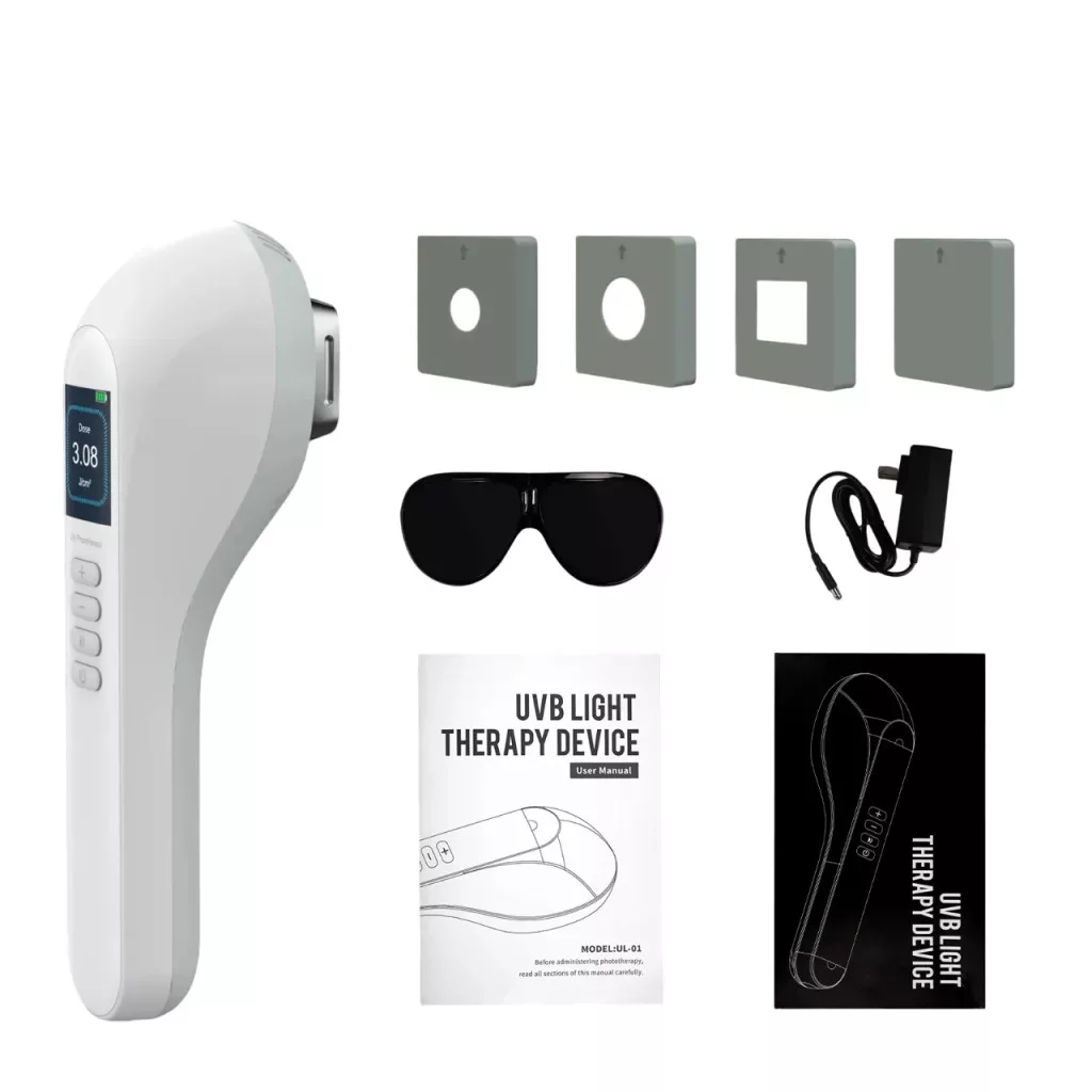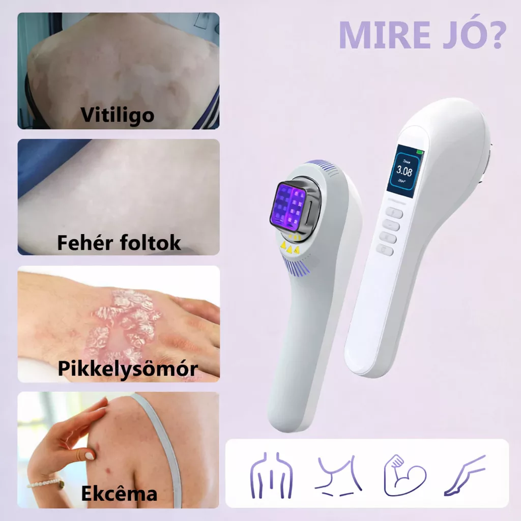 Célzott 308 nm hullámhosszú UV-B fényterápiás készülék, amelyet lokalizált bőrproblémák – például vitiligo, pikkelysömör és ekcéma – kezelésére terveztek. A kis kezelőfelület lehetővé teszi az érintett területek pontos besugárzását, miközben az ép bőrfelület terhelése minimális marad. Az állítható dózis kontrollált, személyre szabható alkalmazást tesz lehetővé. MediLight UV-B készülék otthoni alkalmazás rendszeres, jól tervezhető terápiát tesz lehetővé, idő- és költséghatékony módon. Orvosi javaslat alapján alkalmazva ez a célzott UV-B terápia a felsorolt bőrproblémák esetén hatékony megoldást jelenthet, és hozzájárulhat a bőr állapotának javulásához.